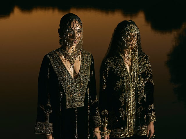 Embroidery plays a defining role, with zardozi continuing to anchor the brand’s visual language. In Mayajaal, it appears with a renewed sensibility. “Zardozi remains the heart of the collection, reimagined in a more contemporary language. Antique gold threadwork is punctuated with gemstones, giving each piece a powerful, regal presence,” Sureena elaborates. The embroidery becomes part of the garment’s structure, enhancing depth and dimension rather than serving as surface decoration alone.