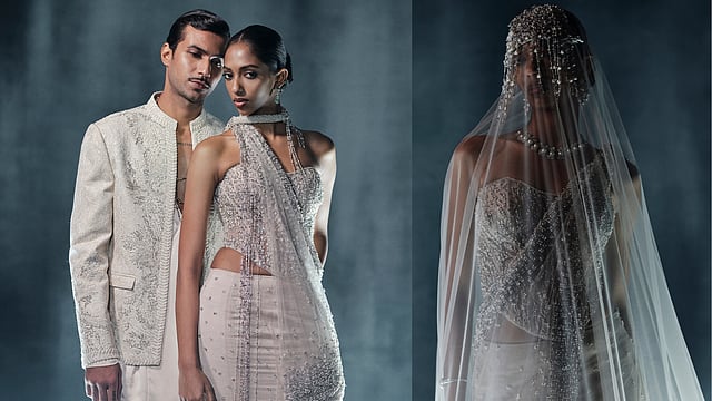 This philosophy explains why even their couture capsules feature varied silhouettes. “For example, Abyssal includes a traditional draped sari alongside another sari with a contemporary corded pallu,” he says. “We like offering multiple interpretations so clients can choose what resonates with them.”