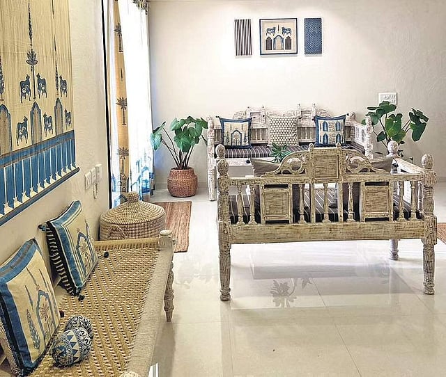 Vraj:bhoomi’s emphasis has always been on working with regional artisans, and Samsara is completely in sync with Dani and Shah’s ethos and design philosophy of contemporary revival and a deep love for textiles and crafts. The couple point out how the corner with a custom-made bench with signature prints mounted on the walls is the most peaceful space. Then, there is a section inspired by Sadhguru. “We wanted to capture the aura Sadhguru reflects in our home and lives, which manifests through the presence of truth, faith and simplicity,” they say.