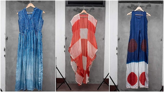 Moving on from his experiments with panels, as seen in God’s Own (his 2016 line), Sreejith’s latest attempt explores the possibilities of tie and dye techniques. Crafted with shibori fabrics—made by Aranya’s artisans who use natural dyes—the week-old line sports eight looks created using 16 different pieces. However, don’t go to Rouka expecting prints, as the 20-something has used the technique to create unusual surfaces.“There are so many variations within shibori like the arashi, which lends a threefold texture to the fabric,” explains Sreejith , whose ensemble features materials such as organza and tussar. While methods like degumming are used to make organza crisp and opaque, the shades featured in the collection ranges between indigo and faded red.
