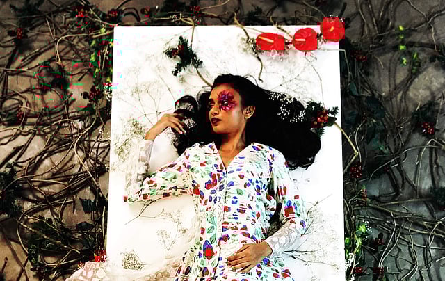 With basic silhouettes in play, expect to find a range of kurtas, crop tops, trousers, capes, and striped saris with bomber jackets. “The collection at Evoluzione will include simpler versions of their fashion week line, where heavy embroidery is replaced with printed replicas,” says the Kolkata-based designer. While the installation at the LFW did not feature a show-stopper, one standout piece from the collection is a gown that the designers made for transgender model Anjali Lama. “It was our first structured gown. Made of organza silk, the garment is primarily print-based with petal embroidery on the bust and has a deep v-neck,” he explains.