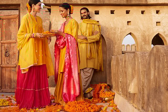 The festive line also presents versatile and comfortable kurtas. They are the most functional and hassle-free clothing at a time when the festivities demand us to be on the move! The kurtas come in viscose, benarasi and tussar silks. They are adorned with intricate embroidery work. What sets them apart is the exuberant colour scheme of bright yellow, hot pink, sky blue, purple, and marigold that instantly captures the festive spirit. With such an impressive lineup of ensembles, more is to come as we tread on the festive season!