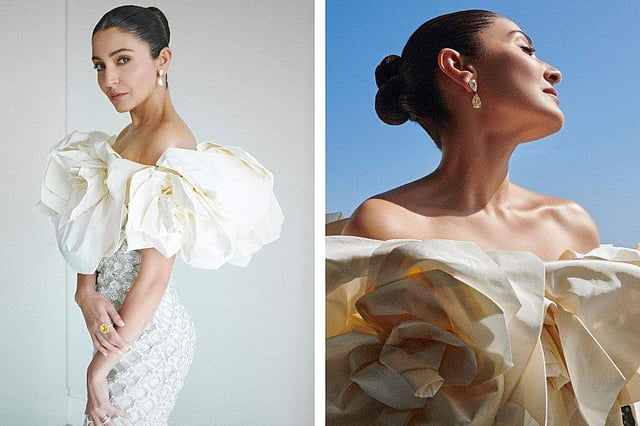 After much anticipation, Anushka Sharma radiated elegance and grace as she finally debuted on the Cannes 2023 red carpet in an Ivory Richard Quinn Couture gown. For the occasion, she chose an off-shoulder ivory number. The gown came with hand-crafted embroidery from the in-house atelier and ivory silk taffeta roses on the shoulder.