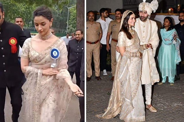 The elegant ivory sari adorned with gold designs featured scalloped borders and intricate floral patterns, with a long, graceful pallu. Alia styled the six-yard drape uniquely, carrying it on one shoulder and allowing it to flow elegantly.