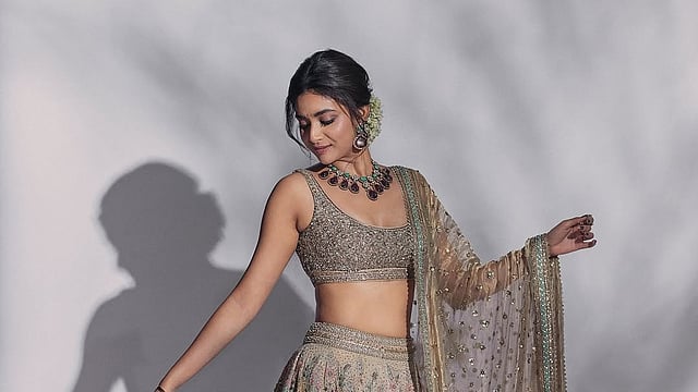 Keerthy completed the look with a matching dupatta draped gracefully around her arms. Her accessories included exquisite kundan earrings, while her beauty look featured a dewy base, glossy pink lips, well-defined brows, and a delicate bindi. Her hair was styled into a sophisticated bun, tying the entire outfit together flawlessly.