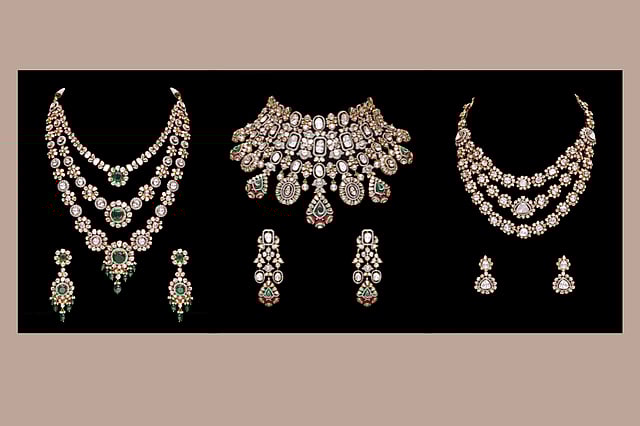 Among the highlights of their collection is the Diamond Polki Set, a breathtaking creation that features a three-tiered necklace crafted in fine gold and adorned with the brilliance of polki diamonds. The intricate design and flawless craftsmanship make this set a true masterpiece of Indian jewellery, perfect for the bride who wishes to make a bold, unforgettable statement on her special day.