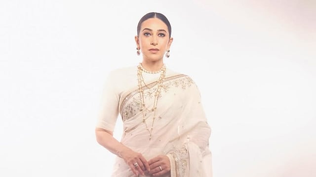 To complete her look, Karisma paired the sari with a simple white blouse, allowing the intricate details of the sari to take centre stage. She accessorised the ensemble with a stunning pearl choker, multiple chain necklaces, and statement earrings, adding a touch of vintage glamour. Her hair was styled in a sleek bun, and her makeup was kept minimal, with a focus on a dewy complexion and soft, neutral tones.