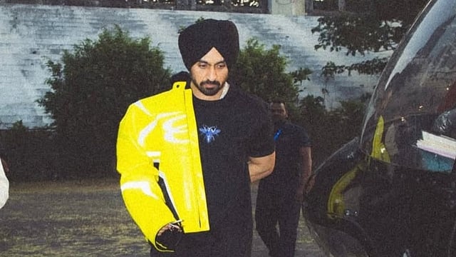 Diljit expertly styled the jacket with a black T-shirt featuring a blue graphic print and paired it with trendy baggy black jeans. His signature black turban and stylish sneakers provided the perfect finishing touches to the ensemble. His perfectly groomed beard and charming smile further enhanced his overall appeal.