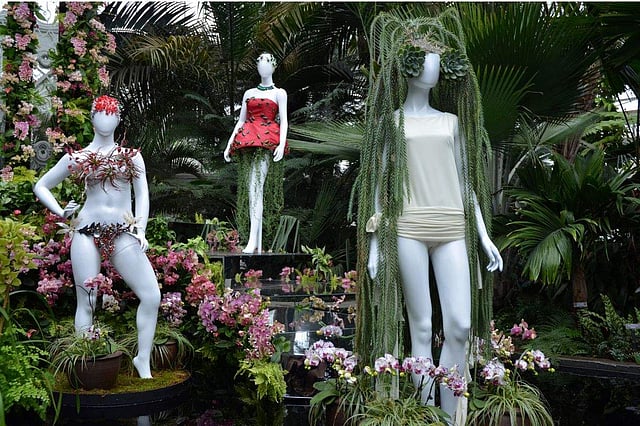 On entering, visitors see Dauphinette's floral dresses on mannequins strikingly arranged on a staircase with mirrors, surrounded by orchids, cyclads, ferns and palms. The outfits are made of colourful living material, including headdresses of tillandsia, or air plants, and tresses of huperzia, a tropical clubmoss.