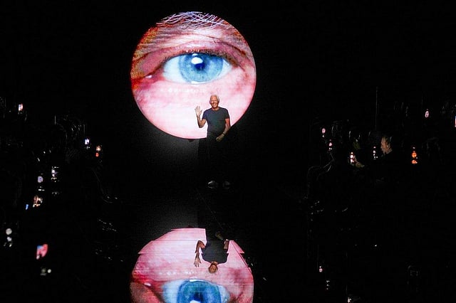 An arresting photograph of one of Giorgio Armani’s penetrating blue, nearly 90-year-old eyes served as a backdrop to Monday’s runway show. Its intensity underlined Armani’s singular role as the guiding force behind his fashion empire for nearly a half-century.