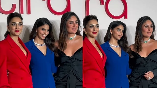 Kareena exuded timeless elegance in a vintage black Yves Saint Laurent dress from 2002, designed by Tom Ford. Suhana opted for a bold and modern look with a bright blue pantsuit, while Kiara dazzled in a red dress adorned with rose accents near the sleeves.