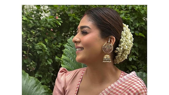 Nayanthara’s accessories were the epitome of minimalist charm. Her choice of golden jhumkas added a traditional yet modern element to her look, while the delicate nath subtly enhanced her ensemble, giving it a refined finish.