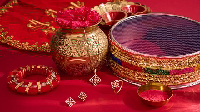 Karva Chauth is a significant festival celebrated by married women in India, marking a day of fasting and devotion for the long life and well-being of their husbands. Observed on the fourth day after the full moon in the month of Kartik, women begin their fast before sunrise and break it only after sighting the moon in the evening. The festival symbolises love, commitment, and the strength of marital bonds. Women often dress in vibrant attire, adorn themselves with jewellery, and participate in rituals that honour the sacred bond of marriage, reinforcing their devotion and faith in their partners.