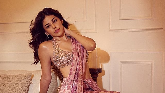 The diva dazzled in a mesmerising pre-draped sari by the renowned Manish Malhotra, looking nothing short of enchanting. The sari, in a soft pink hue, was lavishly adorned with sequins arranged in a captivating pattern, creating a subtle shimmer with every movement. She paired this exquisite piece with a matching halter bralette, featuring a daring plunging neckline and embellished with a scattering of glistening stones that added an aura of pure glamour. Keeping her accessories minimal, Alaya chose a delicate pair of sleek top earrings, allowing the outfit to command the spotlight. Her hair, styled in a casual, tousled manner, complemented her look beautifully, while her makeup embraced a radiant, dewy finish that elevated her elegance to perfection.