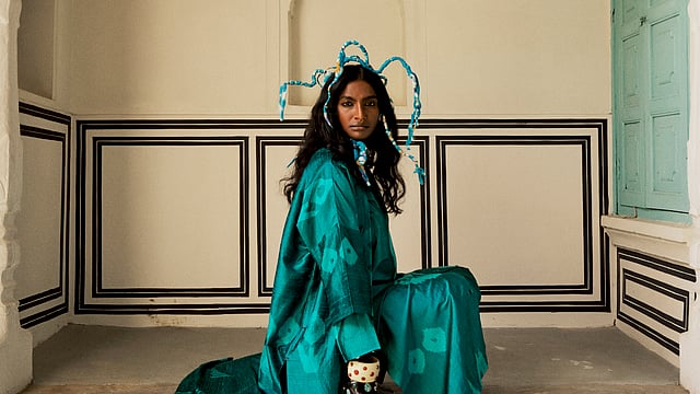 What aligned perfectly with Taram’s design philosophy was the drape. “The fabric has to move effortlessly,” they say. “Our silhouettes are built on comfort, so the drape is always the first thing we study.” Once they understand how a textile flows, the colours and motifs fall into place, allowing them to preserve the authenticity of the weave while giving it a fresh visual language.