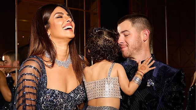 Designer Falguni Shane Peacock, who created the Chopra-Jonas family's ensembles for Siddharth and Neelam Upadhyaya's sangeet, shared a heartwarming photo of the family on Instagram. The picture captures Priyanka and Nick embracing Malti, with Nick gazing lovingly at his daughter as Priyanka laughs. The designer also revealed the details of Malti's adorable lehenga.