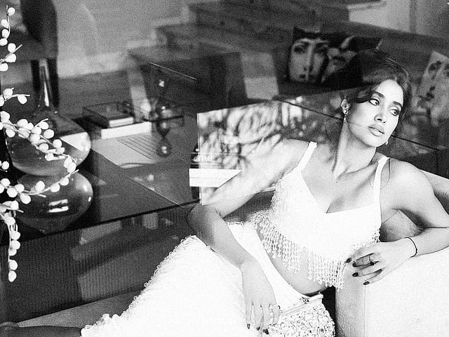 The magic didn’t stop there. Janhvi paired the top with a stunning pencil skirt that hugged her silhouette with divine precision. This midi-length wonder mirrored the teardrop tassels of the corset, creating a harmonious, almost celestial coordination. Its sculpted fit accentuated her figure flawlessly, offering a visual treat that redefined grace and allure.