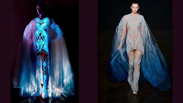 At Paris Haute Couture Week, Iris van Herpen pushed fashion’s boundaries once again—this time, quite literally bringing a design to life. In a show titled Sympoiesis, the Dutch designer stunned audiences with a bioluminescent ensemble crafted using 125 million living microorganisms. The standout look—part dress, part science experiment—is infused with Pyrocystis lunula, single-celled algae known for their moon-like shape and natural glow. When exposed to movement or changes in their environment, the microorganisms emit a vivid blue luminescence. On the darkened runway, their light danced across Iris van Herpen’s signature skeletal patterns, blurring the line between natural biology and futuristic design.