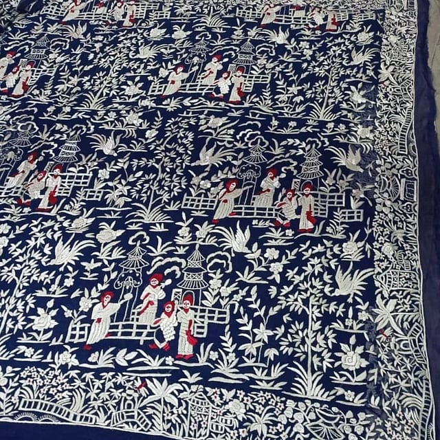 Traditional Gara motifs often include flora, fauna, birds like peacocks and cranes, and scenes inspired by Chinese gardens. The embroidery is usually done in silk thread on georgette or crepe, and the work is dense, intricate, and refined — taking months, sometimes years, to complete. Passed down through generations, Gara saris became treasured heirlooms within Parsi families, worn for weddings, Navjote ceremonies, and other significant celebrations.