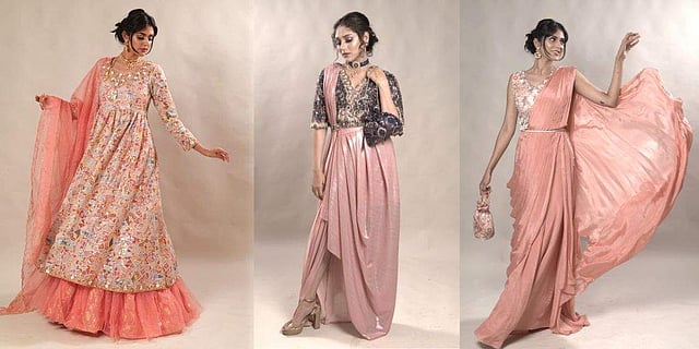 Telling us about the inspiration, she shares, “I love watching sunrises. The reflection of the sun in the water attracted me towards celestial bodies like the stars and the sky. I was fascinated with the life cycle of stars and the light they emit over their life. Sitaraah is my ode to the stars and the dreamy patterns of light they emanate! They transport us to a world of whimsy with different hues. So the name Sitaraah, which literally translates to star, is the perfect fit for my collection.” Further, talking about how she began the design process, she tells us,“I researched on multiple stars and inspired by their rich shades of colours that ranges from bright orange red and grey to white, I commenced designing — using sun signs and flowers as motifs.”