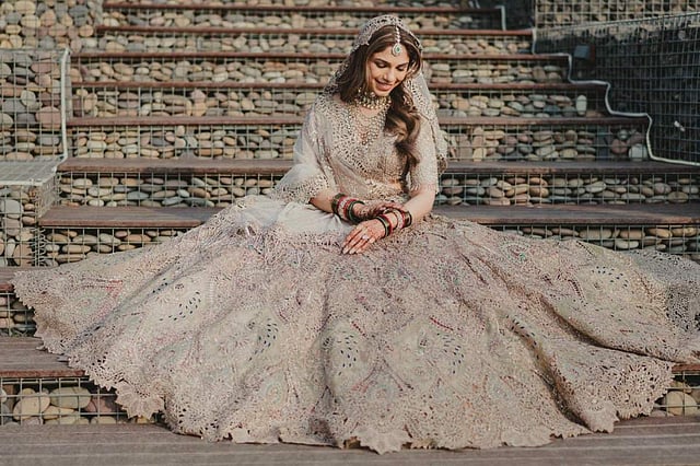 Sharmin paired the exquisite lehenga with an embroidered choli and draped a sheer tulle dupatta with a scalloped cutwork border. A 12-ft-long train added the finishing touch to the graceful sequin encrusted diaphanous tulle veil.