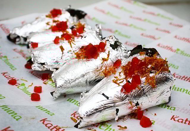 Most importantly they are a non-tobacco store and claiming to be the only FSSAI certified paan store in the city, with plans of opening another outlet in Nungambakkam soon. Praveen tells us how the ‘kattha’ (the catechu paste that is derived from the wood of Khair tree) – that is used as a base on the leaves is of the iwp brand, that has been in the market since 1919. We pick the Night Queen Paan and soon are presented with a roll of betel leaves dusted with coconut shavings. It is a sweet paan and the flavour of the night-flowering jasmine or parijat flower surprises with its definite taste and aroma. However, our curiosity is certainly piqued by the 24-karat gold leaf covered Golden Paan that is a whopping Rs 1,100 apiece. Praveen lets on that it is also called the Honeymoon Paan and is a special concoction made from a dozen natural Ayurvedic herbs that claim aphrodisiac qualities!