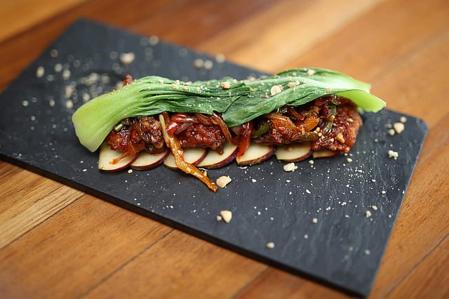 Our first bite from the updated menu was the Chilli Fish with a fruity twist. Topped with thin slices of apple and pak choi, the spicy decadent preparation with sweet notes of apple w a s a fine teaser of the new menu. Another twist that came our way was a fun collaboration between two favoured street foods — singhara and momo, served with a spicy dip. We even tasted their Pesto fondue served with an assor tment of munchies — Vegetable balls, potato fries and croutons. The pesto twist makes this ve getarian appetiser a delight. Another pesto preparation that gave the traditional tandoori chicken a distinct lift was Pesto Tandoori Chicken. Also worth mentioning is the Gourmet Tikka, with a flavourful chicken tikka topped on mash and presented with a piquant turmeric mayonnaise and papad. The desi tikka with a modern presentation will appeal to the food connoisseurs.