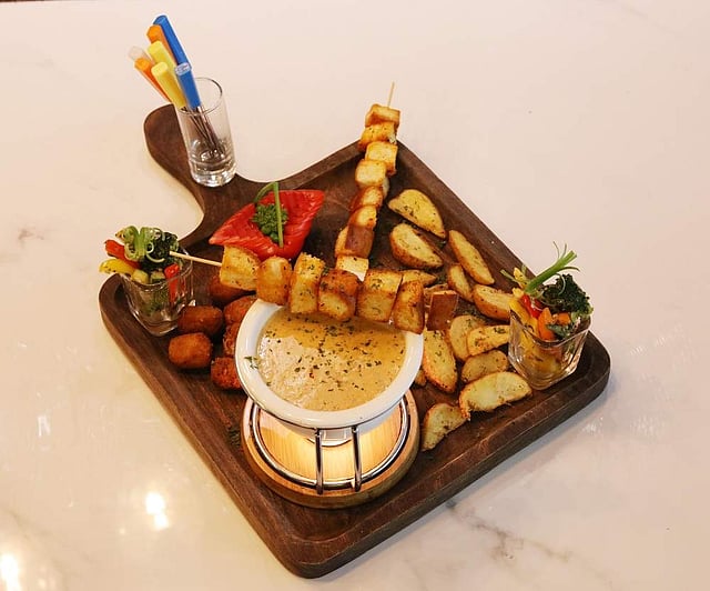 Executive Chef Narinder Pal Singh has used his flair in the menu to represent the theme of the pure vegetarian diner — a fusion of the old and new that is as striking as the eclectic decor. The first dish to entice our taste buds was a fondue, which was a delicious blend of the extremely popular melted Swiss cheese recipe with a twist — Pav Bhaaji. The strong and aromatic spices in the cheese dip pairs best with bread croutons among the other accompaniments and we enjoyed the Cheese Pav Bhaaji Twist. While the 1,600 sq ft diner also has vegan options, there seems to be a bias in favour of Fondue, as there are about five other options. We also sampled a sweet variety — Dark Chocolate Fondue, where thick and warm gooey chocolate replaces the cheese, and fruits like kiwi, watermelon, pineapple and even brownie cubes and Kit Kat sticks replace fritters. The dish is well-suited for a gang of friends.