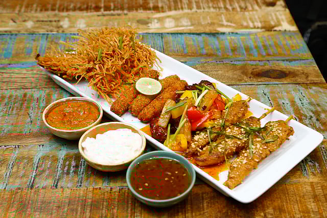 While the table was cleaned with disinfectant and not a sanitiser, the cutlery, we were informed are heated at a particular temperature before serving. On our warm plates, the first item to be served was Barbeque Chicken Pizza with Caramalised Onion. If you like a hint of sweetness in your pizza, then we recommend this one for you. Their non-veg platter with four kinds of meat-based appetisers is a good way to start the meal. Consisting of Fish in Sweet Chilli Sauce, Chicken Satay in Peanut Butter sauce, Panko Crumbs Fish Fry and Burnt Garlic Signature Fried Chicken, it is served with four kinds of sauces. The signature chicken fritter is highly recommended for its extra-crispy coating, a special ingredient that will keep you guessing. We even sampled their coriander-based Leangs Fried Rice with Krabi-style Chicken and loved the balance of flavours in them.