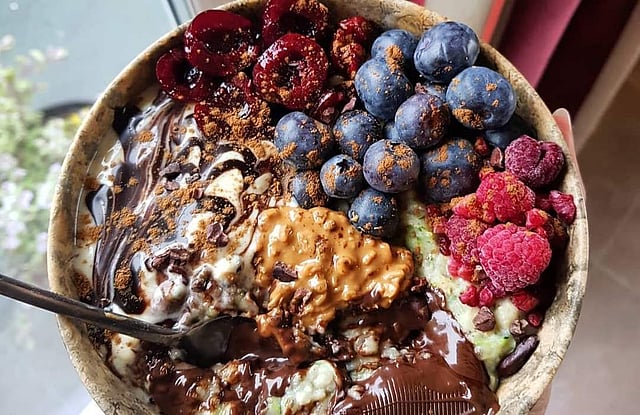 Top it with frozen raspberries, cherries, fresh blueberries, dark chilli chocolate, crunchy peanut butter and cinnamon.