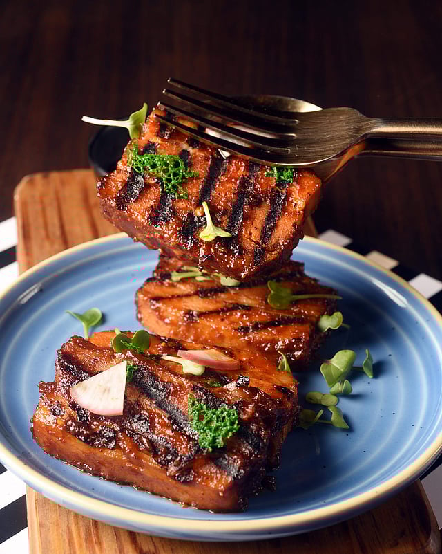 The winter menu at Lord of the Drinks is compact and replete with newly-introduced European flavours. Though the season’s favourite meat, Turkey, eluded our plates, we made peace with chicken, pork and crab tastefully cooked by the house chef. The appetiser section, comprising eight dishes, leans heavily on the non-vegetarian side and features exciting options for those devoted to pork. There’s Pork Belly BBQ, Belgian Por n Ribs and Pulled Pork Taco with BBQ Sauce.