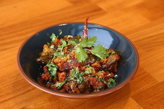 The festival menu is varied but has a focus on shareable, easy-to-plate numbers and each course lines up recipes that are similar in profile. For instance, we started our meal with a delicious round of Posto Pyaz er Bora and a superbly crunchy Mourola Chop, both bona fide Bengali summer appetisers; one can also opt for a Maharashtrian sabudana vada. We followed it up with a stunning Bharli Vangi that’s finished with a Konkani spiced coconut relish.