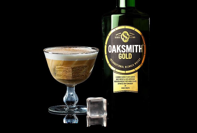 ○ Add all the ingredients, except the Oaksmith Gold and the nutmeg powder, to the shaker and shake it hard, without ice, to emulsify the ingredients and create a froth. This is known as a dry shake. Now add ice, the measure of Oaksmith Gold and shake the drink once again. Fine strain into a chilled coupe glass.