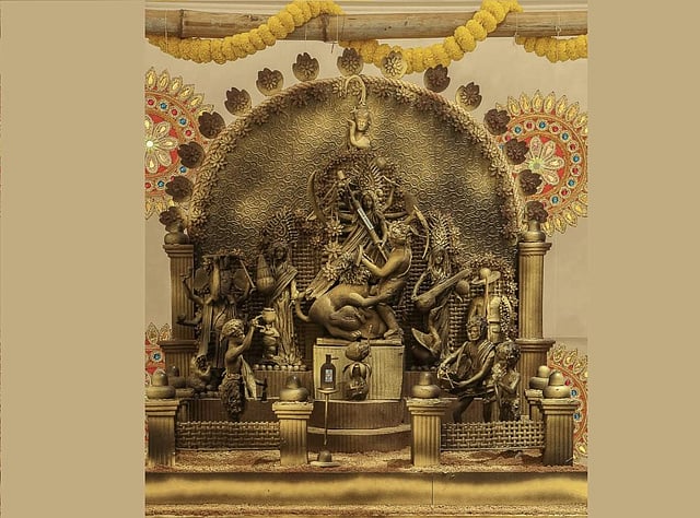 Showcasing their mastery in culinary art, the master chefs at ITC Royal Bengal and Sonar have crafted a grand structure of the Durga idol with gourmet chocolate. Utilising 35 kgs of chocolate the structure with an ombre finish took 40 days or 353 man-hours to build with 10 chefs reimagining the gods and goddesses and the fight of good over evil as the fight against coronavirus. Complete with pandal base, figurines and floral decoration, it is also a tribute to all those who helped make the situation better with knowledge, strength and resilience.