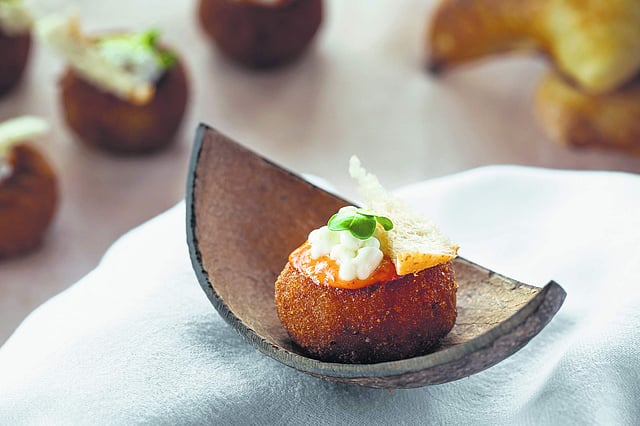 Like Sweet Potato in Balcao cream atop the unndo we tasted at the Hilton’s most recent edition of the event, last August, which has a hard crust and is spongy on the inside. Or chef Karthikeyan’s unique Maas-ka-pao, an ode to Goa’s love for canapes with a tart base made from a crumble of the popular pao. The filling, we find out, is an innovative liquified pâté of vindaloo and the final touch... a sphere of 10-year-old artisanal feni that makes the whole experience pop