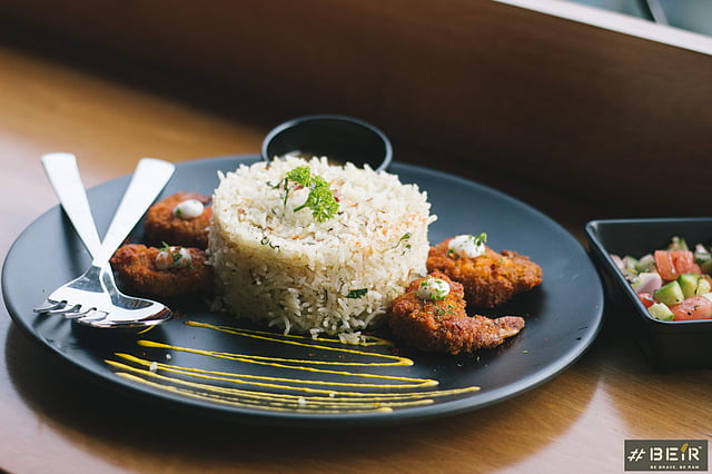Apart from these, they also have signature cocktails. We tried the Summer of Church Street, a mango and vodka drink and the Highway to Hell, a pineapple and chilli concoction. When it comes to food, #Beir has a range of Indian and global starters. Our first dish was the Crispy Corn Chat. Crunchy and spicy, it is a perfect accompaniment to the drinks. Next on the table were the Ricotta Spinach Cheese Balls. Spinach and ricotta are always a winning combination and the crispy coating on the dumplings made this one a winner. We were also served the Buffalo Chicken Wings and the Panko Prawns. While the former was well made and moreish, the latter impressed us with its panko coating.