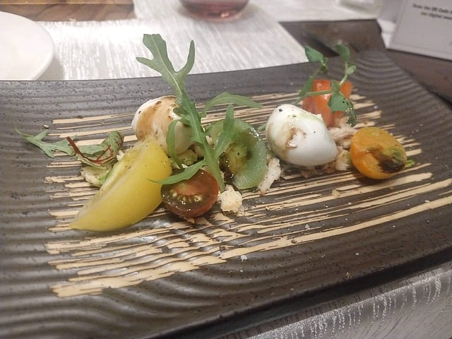 We started with the classic Caprese — diced heirloom tomatoes, arugula, mozzarella and crushed croutons. This was light, fresh and textural. The Tuna Tartare, with a sprinkling of Indian spices, spiced mango and fennel dressing and a turmeric tuile was a perfect balance of fragrant and umami notes. Next, we were served the Porcini Consomme. Chopped and sauteed enoki, shimeji and black truffle, were placed at the centre of our bowl. The consomme, warm and aromatic, was poured into the bowl at the table. Comforting and bursting with flavour, this was also a hit.
