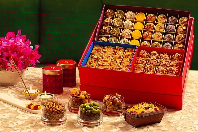Sheraton Grand Bangalore Hotel offers four variants of gift boxes this Diwali. The Shubh box contains items like a gourmet jar of nuts and sour cherries; the Chamak box has treats like chocolate-coated blueberries and jamun honey; the Diwali Delight box is filled with hand-rolled traditional sweets like rose petal ladoo and Kashmiri kalakand and the Diwali by Marriott hamper contains desserts like pista mista and orange blossom.