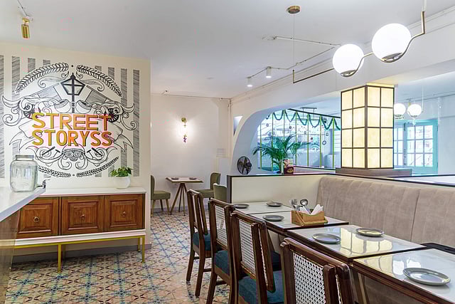 from orange juice, passion fruit and soda) contained in the fancy glass detailed with chupa chups resembling the colours of the evening sky set the tone for supper. This drink from Street Storyss’ brand-new menu, offering a bunch of vegan and Jain options, assured us that interesting dishes were headed our way. Besides the new menu, the restaurant has some other updates, which include a new underground dining space and an expanded kitchen in the making.