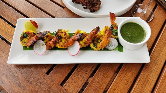 We began our culinary trail with the Tandoori Sea Prawns and Persian Kebab. The fresh prawns were cooked using chilli, yoghurt and mustard and served with kairi (raw mango) mint chutney. Subtly flavoured, this dish was creamy and when mixed with the chutney, tasted even better! As for the kebabs, they were marinated in Persian spices and served with a salad and borani dip. Flavourful and juicy, these kebabs were delicate and the Persian spinach yoghurt dip along with it was a match made in heaven. We paired these delicacies with Dutch Courage, which was a sweet cocktail made using rosemary gin, blood orange purée, elderflower and lime.
