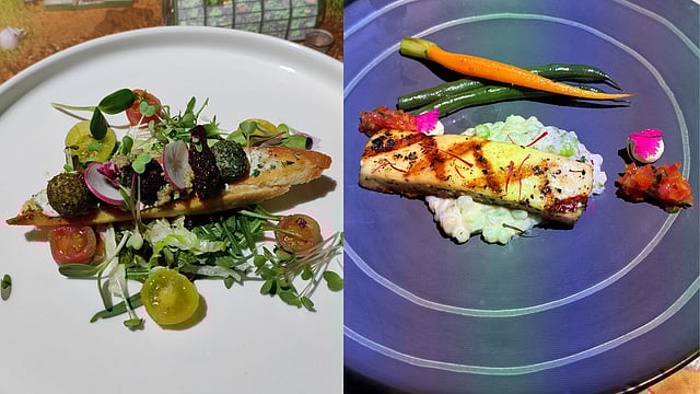 Lobster tail thermidor arrived next, its flesh soft and was gently sweet beneath a parsley cream sauce that added smooth richness. By now, the tiny chef had dramatically perished and returned more than once, each mishap punctuated by laughter around the table. Dessert arrived beneath a thin sheet that was theatrically set alight at the table. Beneath it waited a coconut and jaggery creme brûlée. The caramelised top cracked cleanly under the spoon, giving way to a creamy base with deep, rounded sweetness from the jaggery.