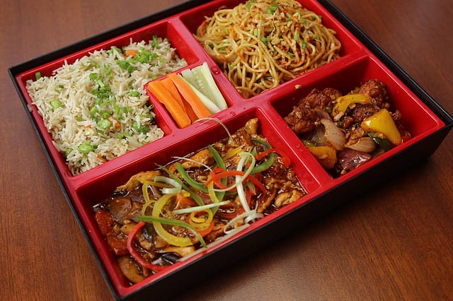 The main course was a set non-vegetarian bento box meal consisting of five items. A vegetarian box is also available for choice. The boneless chicken chunks fried till brown and slightly crispy on the outside tossed in Sichuan sauce with slices of bell pepper and onions were the perfect crunchy starter. The semi-gravy Sichuan chilli chicken was mildly spicy and definitely a dish to look out for.