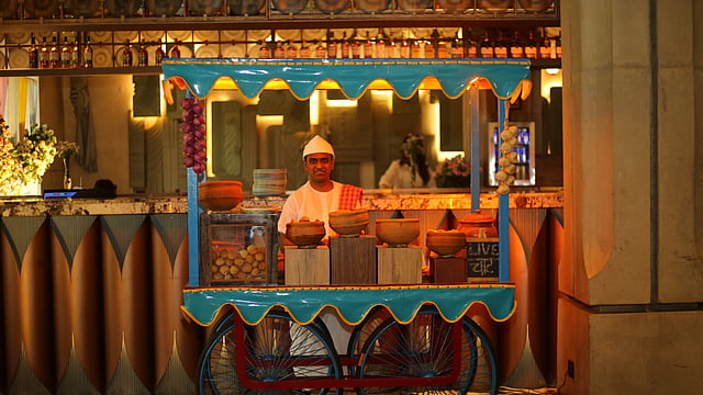 With live music and soft sun on the terrace, the brunch makes for a perfect family outing on a chilly Sunday. We skipped soup and bread and jumped right onto the lip-smacking appetisers, starting with the gooey Cream cheese and water chestnut dumplings. The chilli oil added to its flavour profile. The Smoked salmon sushi, up next, was so flavourful that we ended up having quite a few. Before we moved on to the robust dishes, we tried a tangy and spicy treat from the live chaat counter.