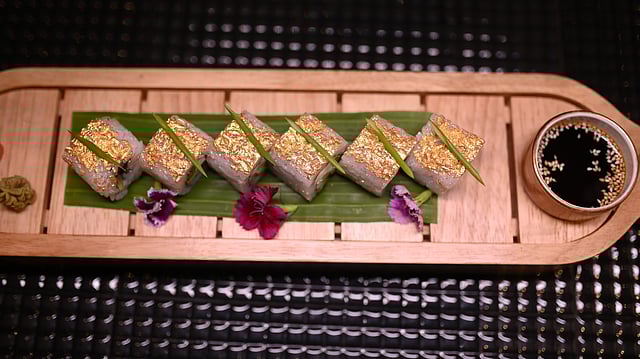 For all the health-conscious individuals the Mediterranean-inspired Buddha bowl with its avocado, tomato, onion , lettuce, broccoli, chicken and feta cheese played with the colour and texture of the dish. We felt the salad could have had a slight tang that would have elevated the dish. Up next was the Avocado Asparagus Sushi in an elegant Asian boat. The gold dust on the sushi gave it a royal touch. These non-spicy vegetarian sushi pieces were rectangular bundles of joy to dip in the soya sauce, wasabi pecks or eat with pickled ginger slices. Coffee lovers in the house can take a glass of College Street Martini, a cocktail made with hazelnut and coffee to go along with the dish.