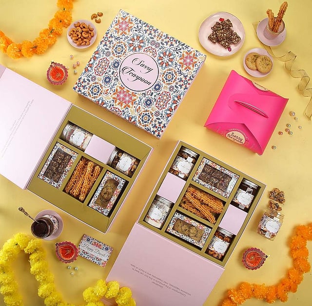 Invest in a sassy bouquet of premium confections from Sassy Teaspoon helmed by Le Cordon Bleu alumna Rachel Goenka. It can be your perfect choice of brand for gifting some artisanal desserts that have a good shelf life. Choose from their curated festive hampers comprising cookies, bakes and brownies to add to your Diwali bouquet of goodies. And if you are in Mumbai or Pune, you can drop by their outlets to customize your very own celebratory gifts.