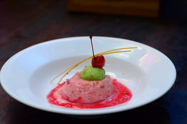 From the menu, that boasts of fusion food we sampled Chingri Malaikari Pizza, a delectable blend of the classic Italian and Bengali dish. The thin crust pizza with toppings of shrimp was surprisingly tasty and we devoured one slice after anoth er. The Thelawala Noodles, inspired by local roadside chowmein, came in a mini cart. The best thing about it is, you don’t need an accompaniment. The summer menu also includes a Mint Cooler, Raw Mango and Jalapeno Martini, Blue Sky and more. From the bites section, you can try Parmesan Crusted Fish, Jhakkas Wings and more.