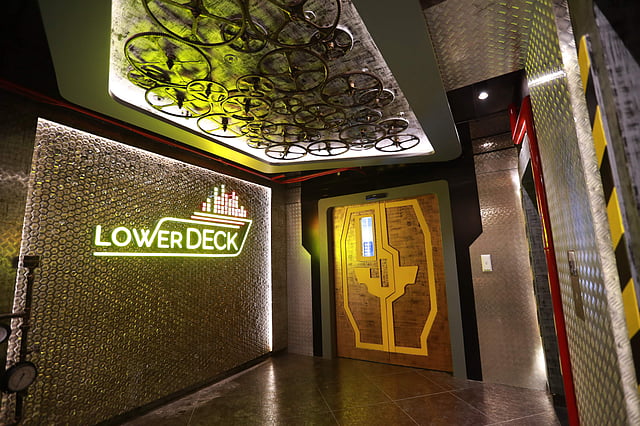 We’re at a new watering hole in town. And from the name — Lower Deck — it’s no surprise that this expansive 8,000 square foot space is located in the basement of hotel Park Elanza. And, as one can chance a guess — it’s designed like a ship — with elements of décor including lifeboats on the wall, porthole-style windows and the wheel aptly placed in front of the man steering the playlist, the DJ!