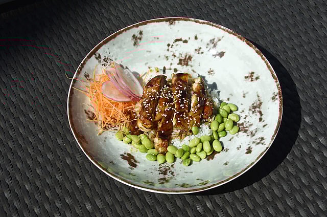 From the ‘Big Eats’ section — we sample a plate of Chicken Teriyaki Donburi. A Donburi bowl (Japanese rice bowl) usually offers up a balanced meal of protein and vegetables and this one with steaming sticky rice paired with mildly sweet teriyaki glazed chicken, carrot tshuma and bright pops of green from the edamame — is warming and a good choice in this wet monsoon weather.