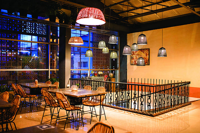 After dining at home from cloud kitchens through the lockdown, it feels pretty luxurious to be sitting in the spacious 4,000 square foot Madras Canteen & Grill. Just a couple of weeks old, this new space in Perungudi makes a memorable first impression with its tasteful décor woven around tropical vibes and sustainable bamboo light fixtures. And we are tickled pink when we head over to the bathroom and spot brass urali pots repurposed as basins!