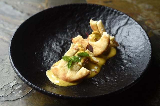 The mains feature a number of gravies that arrive in everything from glass bottles to banana leaves. We recommend the sunshine yellow Kashmiri Gosht Curry served with Bakarkhani bread. The latter is sweet and almost biscuit-like, making for an interesting texture alongside the curry. In stark contrast is the tangy Kanyakumari Meen Kozhambu, which is not to miss and the homely Kanyakumari Kattu Soru (rice wrapped in a banana leaf with bits of chicken, mutton and egg). Simple, rustic and fulfilling. Dessert is a toss-up between a Karupatti Halwa tart, rich with palm jaggery and ghee, and Gulabi ice cream. The latter has our heart as it arrives with a frozen rose, courtesy liquid nitrogen.